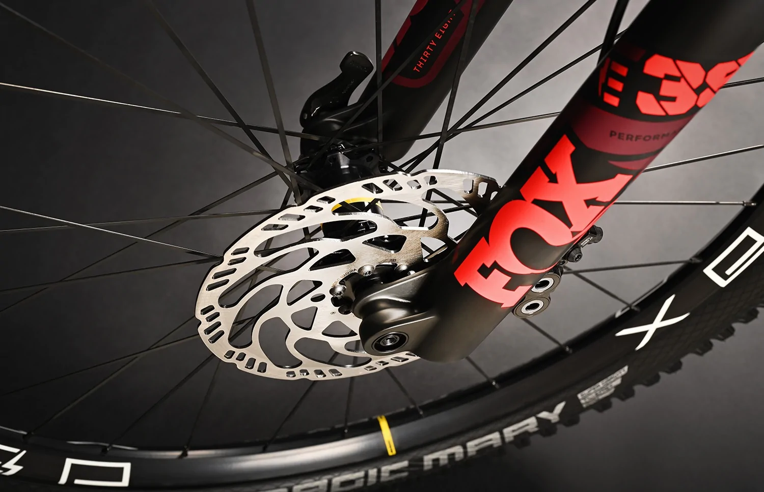 • FOX Fahrwerk mit 180 mm Federweg: Maximale Kontrolle bei jedem Drop und jeder Wurzel.